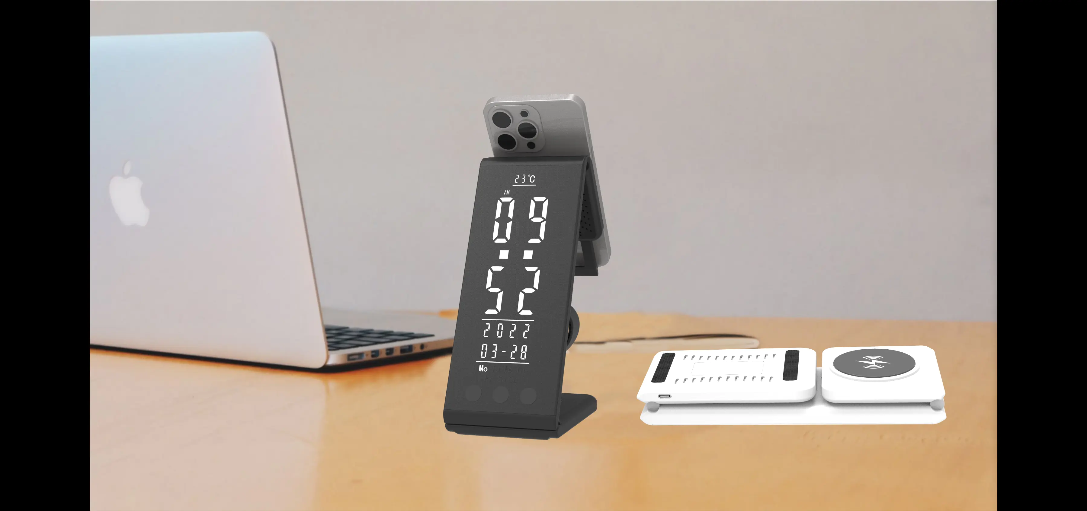 The wireless charging pad is compatible with most Qi-Certified smart phones, cell phones, watches and wireless earbuds, makes it a nice bedside alarm clock and wireless charging station.
